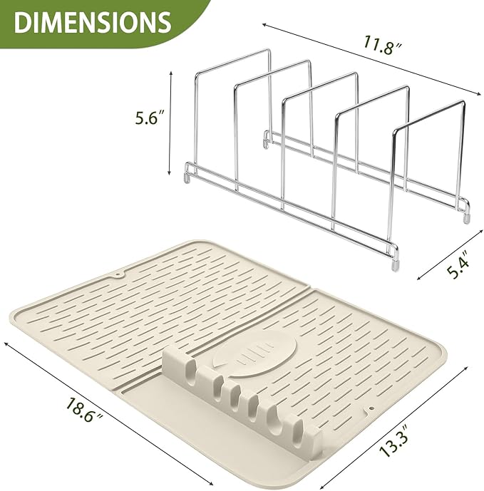 - SPACE-SAVING: The rack (5.6"H x 5.4"W x 11.8"D) is convenient for small counter spaces or compact cabinets, while the foldable mat (18.6" x 13.3") handles pots and multiple utensils with ease