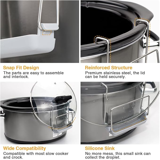 - Please Notice - The package includes 2 main structures and 2 silicone sink. This lid holder is compatible with most slow cookers. You can hang the bend part in the gap between the stoneware and heating base or on the edge of the stoneware.